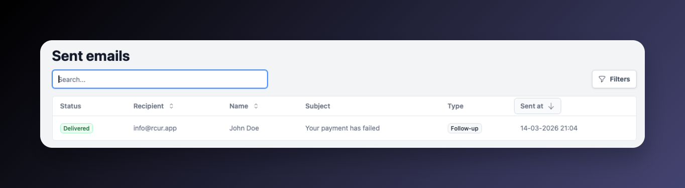 New! Have an overview of all emails sent from RCUR. For each email, you can see the status and review the content to see exactly what was sent to your customer. This way, you stay even more on top of things.
